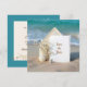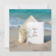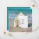 Um cartão de convite de casamento em branco é elegantemente colocado contra um cenário de praia, acompanhado por delicadas flores de gipsófila brancas, uma estrela do mar e uma moeda de areia.