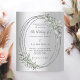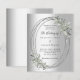 Um fundo com aparência prateada falsa. Uma moldura oval prateada decorada com folhagem verde-sage. Personalize e adicione seus nomes, detalhes. Texto preto.
