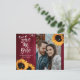 Convite personalizado de casamento rústico com bordô e girassóis para salvar a data com foto em cartão postal com fundo de madeira de celeiro com luzes de corda e girassóis. Design de cartão perfeito para um casamento rústico country bordô, ou festa de casamento em celeiro inspirada em girassóis.