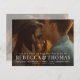 Um tipo moderno de sobreposição com nomes grandes e uma foto de sangria total são as características deste convite de casamento. Clique no botão de edição para personalizar este design.