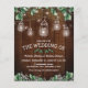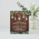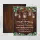 Convites de casamento rústicos e econômicos com uma fachada de celeiro de madeira escura, folhagem de árvore verde, luzes de jarra de pedreiro com pisca-pisca, flores de bebê e um modelo de casamento moderno e editável.