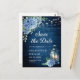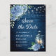 Hortênsia azul em madeira azul rústica com lanterna clássica. Cartão postal de Guardar a Data.