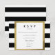 Cartões de resposta / RSVP de convite de casamento quadrado moderno com fundo de listras pretas e brancas e moldura com efeito de folha de ouro.
