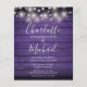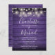Um convite de casamento rústico econômico e elegante com lindas luzes de corda, nomes em estilo de assinatura e tipografia chic em um fundo de madeira roxa rústica. Criado por Thisisnotme©