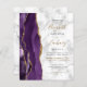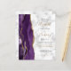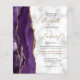 A borda esquerda deste convite de casamento moderno e elegante apresenta uma borda de ágata em aquarela roxa aparada com brilho dourado falso. O texto personalizável combina caligrafia preta e dourada, fontes copperplate e itálicas em um fundo de mármore cinza e branco. O padrão de mármore cinza e branco é repetido no verso do cartão.