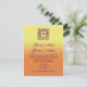Um convite de casamento inspirado em boêmio com fundo laranja e amarelo em tons de joia com texto roxo escuro e design quadrado no topo com monograma. A redação é da noiva e do noivo.