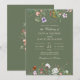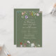 Um convite de casamento verde-oliva terroso com flores silvestres coloridas dispostas em uma composição suave inspirada em um prado. O design botânico natural evoca romance rural e charme de celebração ao ar livre.