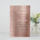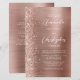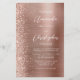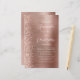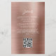 A borda esquerda deste convite de casamento moderno e elegante apresenta uma falsa borda cintilante em rose gold. O texto personalizável combina fontes de caligrafia branca, copperplate e itálico em um fundo de falso metal polido em rose gold. O verso fornece espaço para detalhes do casamento em um fundo de metal polido em rose gold, junto com um código QR que os convidados podem escanear para visitar seu site e responder, o que economiza o custo de impressão e envio de cartões de resposta separados.