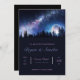 Bonito Convite para Casamento com um esquema de cor azul e roxa que mostra uma floresta escura, uma lua de cheio e um cheio de estrelas no céu.