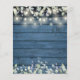 Um convite de casamento para o orçamento rústico com luzes bonito de cordas e salões e lilás que caem sobre um pano de fundo azul de madeira rústica e seus detalhes de casamento são definidos em texto elegante clássico. Projetado por Thisnotme©