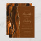 A borda esquerda deste elegante convite de casamento moderno apresenta uma laranja queimada e uma aquarela marrom aparada com falsa brilho dourado. O texto personalizável combina manuscrito dourado, copperplate e fontes itálicas em um fundo marrom noz. O lado inverso apresenta um design agate correspondente.