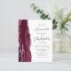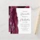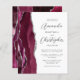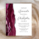 A borda esquerda deste elegante e moderno convite de casamento mostra uma cor vermelha e entrelaçada de água com uma falsa brilha prateada. O texto personalizável combina o script de cinza de carvão e as fontes sans serif em um fundo branco. O lado inverso apresenta um design de burgundy e agate prateado.
