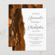 A borda esquerda deste elegante convite de casamento moderno apresenta uma cor de água laranja queimada, aparada com falsa brilho dourado. O texto personalizável combina o script de cinza de carvão e as fontes sans serif em um fundo branco. O verso apresenta uma design de cor laranja queimada e dourada.