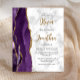 A borda esquerda deste elegante convite de casamento moderno apresenta uma cor d'água roxa, borda agitada, aparada com falso brilho dourado. O texto personalizável combina um script de caligrafia dourada e fontes de sans serif pretas em uma cinza e fundo de mármore branco. O verso apresenta um design de agate roxo e dourado correspondente.