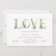 Barato personalizado de convites de casamento impressos personalizados com seus detalhes de evento. Este elegante design apresenta uma tipografia foil dourada LOVE com delicada folhagem azul e esverdeada em fundo branco. Use as ferramentas de design para personalizar o texto, editar as fontes e cores ou adicionar suas próprias fotos para criar um convite de casamento de classe e na moda.