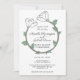 Um convite de casamento único moderno, com uma floral branca em forma de anel de casamento com duas flores em forma circular. Simples elegância. Os nomes são apresentados em uma tipografia moderna de roteiro contrastada com um tipo clássico de serifa.