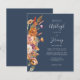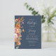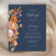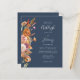 A borda esquerda deste convite romântico de casamento apresenta um buquê floral de cor d'água de tons de terra queimados de laranja, terracota e marfim no outono. O texto personalizável combina letras de mão, placas de impressão e fontes itálicas em cinzas pálidas em um fundo azul marinho. O verso é um azul marinho sólido coordenador. NOTA: os envelopes não são incluídos automaticamente nestes convites de orçamento, portanto lembre-se de escolher a opção "envelopes brancos"!