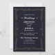 Este convite apresenta um quadro de deco de arte dourado num fundo de marinho.
