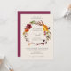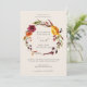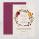 Nosso convite para o casamento no outono enquadra seus nomes com uma elegante borda de coroa floral em tons de burgundy, laranja, vermelha e rosa pincelado com folhagem verde esmagadora. Personalize com suas informações ou clique em "Clique para personalizar mais" para editar estilos de fonte, tamanho e cores.