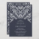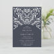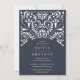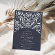 Convites de casamento vintage elegantes em rico azul-da-meia-noite apresentam ornamentado detalhando que evoca a aparência do papel cortado no estilo papel picado.