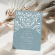 Elegantes convites para casamentos vintage em azul empoeirado com um toque de ornamentado aqua detalhando que evoca o aspecto do papel cortado em estilo papel picado.
