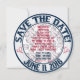 Cartões de convite redondos com tema de casamento de beisebol. Este é personalizado para um cliente específico. A frente do cartão é uma moldura/inserção de foto. Anéis azuis interno e externo com uma foto personalizada no centro. Círculos de texto em vidro decorativo na parte superior e diz: SALVE A DATA. Mais círculos de texto em vidro na parte inferior e diz a data do casamento dos clientes. Este texto está em ambos os lados do cartão. O fundo da borda externa é listras azuis e brancas de beisebol. No verso do cartão, você tem o mesmo texto no topo e na parte inferior em um fundo listrado. Pequenos enfeites de coração vermelho sentam-se entre as palavras. O fundo do centro é branco sólido com bolas de beisebol espalhadas por todo o lado. Texto decorativo em vidro diz: Mathew Howard e Sylvia Newcomb estão subindo para o home plate e rebatendo 1000 que seu amor vai durar para sempre. As equipes se fundirão em uma em 11 de junho de 2016. Os convites com tema de
