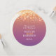 Belas bolhas gráficas de champanhe fazem convite de casamento em matizes de laranja roxo e ouro. Um simples convite de casamento contemporâneo, com uma arte gráfica de efeito de bolha, perfeita para um casamento de bolhas modernas e champanhe. Edite este convite com suas próprias palavras. Design e gráficos de Sarah Trett.