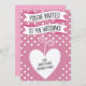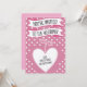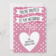 Convite de casamento encantador e divertido, com uma doce design bolinhas em rosa e branco. Esta placa personalizável inclui um coração decorativo com texto de faixa de rendas e na moda. Perfeito para casamentos modernos, caprichosos ou inspirados em vintage. O design combina o romance clássico com o talento contemporâneo, apresentando espaços personalizáveis para a noiva e os nomes do noivo