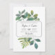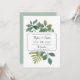 O convite de casamento botânico da Vintage mostra seus detalhes de casamento organizados exclusivamente em blocos escura e letras de caligrafia, sobre um fundo de folhas de cor verde-d'água pintadas, galhos, samambaias e folhagem. Convites invertendo a verde-senso sólido.