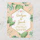 Todo o texto e fontes são editáveis! Cactos e suculentas em aquarela preenchem o fundo deste adorável convite. Rosa bege e dourado com uma moldura geométrica. Verso correspondente incluído.