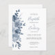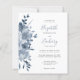 A borda esquerda deste convite romântico de casamento apresenta um buquê floral de cor d'água de flores azuis poeirentas e verde. O texto personalizável combina manuscritos, compêndios e fontes itálicas em cinzas poeirentas de azul e carvão em fundo branco. Adicione mais detalhes no verso, juntamente com um código QR para ajudar seus convidados a visitar seu site de casamento.
