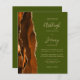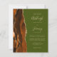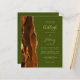 Economize o custo de imprimir e enviar cartões RSVP separados com este elegante convite de casamento de orçamento integral. A borda esquerda apresenta uma cor de água laranja queimada e ferrugem, borda agitada com brilho dourado. O texto personalizável combina manuscritos, placas de impressão e fontes itálicas em um fundo verde-oliva. O verso fornece espaço para detalhes do casamento em um fundo verde-oliva sólido, junto com um código QR que os convidados podem digitalizar para visitar seu site e RSVP.
