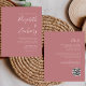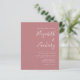 Este simples convite de casamento moderno contém um texto branco sobre um fundo poeirento de rosa. Adicione os nomes da noiva e do noivo na caligrafia de escrita manual do na moda e os detalhes na fonte sans serif. O verso fornece espaço para detalhes do casamento em um fundo de rosa poeirento sólido, junto com um código QR que os convidados podem digitalizar para visitar seu site e RSVP. NOTA: os envelopes não são incluídos automaticamente nestes convites de orçamento, portanto lembre-se de escolher a opção "envelopes brancos"!