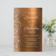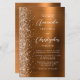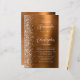 A borda esquerda deste elegante convite de casamento moderno apresenta uma borda cintilante de laranja queimada. O texto personalizável combina manuscrito branco, fontes em copperplate e itálico em um fundo vermelho de metal piscado de cor laranja queimada. O verso fornece espaço para detalhes do casamento em um fundo de metal vermelho em laranja queimado, juntamente com um código QR que os convidados podem digitalizar para visitar seu site e RSVP, o que economiza o custo de impressão e envio de placas RSVP separadas.
