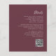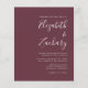 Este simples convite de casamento moderno mostra um texto branco sobre um fundo burgundy. Adicione os nomes da noiva e do noivo na caligrafia de escrita manual do na moda e os detalhes na fonte sans serif. O verso oferece espaço para detalhes do casamento, juntamente com um código QR que os convidados podem digitalizar para visitar seu site e RSVP, o que economiza o custo de impressão e envio de RSVP separados. NOTA: os envelopes não são incluídos automaticamente nestes convites de orçamento, portanto lembre-se de escolher a opção "envelopes brancos"!