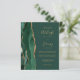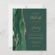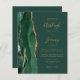 Economize o custo de imprimir e enviar cartões RSVP separados com este elegante convite de casamento de orçamento integral. A borda esquerda apresenta uma esmeralda verde aquarela agate border aparada com brilho dourado. O texto personalizável combina manuscrito dourado, fontes em copperplate e itálico em um plano de fundo verde. O verso fornece espaço para detalhes do casamento em um fundo verde sólido, junto com um código QR que os convidados podem digitalizar para visitar seu site e RSVP.