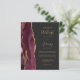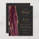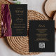 Economize o custo de imprimir e enviar cartões RSVP separados com este elegante convite de casamento de orçamento integral. A borda esquerda apresenta uma borda de cor d'água borrifada, aparada com brilho dourado. O texto personalizável combina manuscrito dourado, fontes em copperplate e itálico em um fundo preto de slate. O verso fornece espaço para detalhes do casamento em um fundo preto de ardósias sólidas, junto com um código QR que os convidados podem digitalizar para visitar seu site e RSVP.