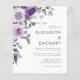 Este convite de casamento moderno apresenta um arranjo de aquarela de flores roxas e lilás e eucalipto verde arquejando no canto superior esquerdo. Edite o texto serif da cinza de carvão com os nomes dos casais e os detalhes do casamento em um fundo branco. O verso é branco sólido. NOTA: os envelopes não são incluídos automaticamente nestes convites de orçamento, portanto lembre-se de escolher a opção "envelopes brancos"!