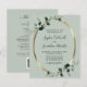 Convite de Casamento em Eucalipto e Dourado Metálico Sage Budget All in One... Nosso convite de casamento botânico luxuoso "All in One" da linha Budget apresenta uma moldura oval dourada metálica adornada com folhas de eucalipto em tom esmeralda sobre um fundo verde sage claro. A parte de trás do cartão, na cor sage clara, contém todos os detalhes que você normalmente veria em cartões separados no pacote de casamento. Este convite de casamento de estilo moderno foi projetado para ser elegante e econômico... sem falar em economizar tempo. Na parte de trás, há também um modelo de código QR que você pode substituir pelo seu próprio código (ou excluir se não planeja usá-lo). Todo o texto de exemplo pode ser facilmente revisado com suas próprias informações no modelo de personalização. POR FAVOR, OBSERVE: Os cartões Budget não vêm automaticamente com envelopes, como os convites tradicionais, mas você pode comprá-los na mesma página ao finalizar a compra, se desejar. Este design "all in one" também está disponível em um cartão de convite de casamento tradicional