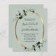 Convite de Casamento Eucalipto em Tom de Dourado Metálico e Verde Sal via "All in One" econômico... Nosso convite de casamento botânico luxuoso "All in One" econômico apresenta uma moldura oval dourada metálica adornada com folhas de eucalipto em tom esmeralda sobre um fundo verde sal claro. A parte de trás do cartão, também em verde sal claro, contém todos os detalhes que você normalmente veria em cartões separados no pacote de casamento. Esse convite de casamento de estilo moderno foi projetado para ser elegante e econômico... sem mencionar que economiza tempo. Na parte de trás, há também um modelo de gráfico de código QR que você pode substituir pelo seu próprio código (ou excluir se não planeja usá-lo). Todo o texto de exemplo pode ser facilmente revisado com suas próprias informações no modelo de personalização. POR FAVOR, OBSERVE: Os cartões econômicos não vêm automaticamente com envelopes, como os convites tradicionais, mas você pode comprá-los na mesma página no checkout, se desejar. Esse design "All in One" também está disponível em um cartão de