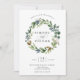 Os convites de casamento botânico elegantes apresentam uma coroa de folhas de eucalipto, folhas verdes e pequenos marinhos azuis, cercando seus nomes. Personalize com seus detalhes de casamento embaixo.