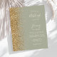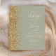A borda esquerda deste elegante convite de casamento moderno apresenta uma borda falsa de ouro. O texto personalizável combina manuscrito de marfim, fontes em copperplate e itálico em um fundo verde de sábio. O verso apresenta um design verde-sábio e dourado correspondentes.