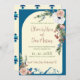 Winter Mountain Flowers Invitation com lindas flores brancas e cor-de-rosa de inverno, flores de champanhe de inverno, verde-rosa de inverno e bagas vermelhas em um belo fundo azul de inverno. A parte traseira da carta apresenta um design sudoeste com blues e beiges. Coordena-se com o envelope correspondente e com a Coleção de Flores da Montanha de inverno.