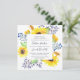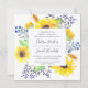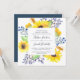 Nosso convite de casamento Flowerfields em um formato quadrado único enquadra seus detalhes de casamento com flores de sol amarelas, folhas verdes exuberantes e botões roxos e azuis. Uma bela escolha para o verão ou casamentos outono rústicos no campo ou em ambientes externos.