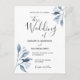 Um convite de casamento simples e moderno em branco, azul prateado e azul clássico. Um fundo branco chic na frente. Decorados com ramos botânicos de cor azul-prateada e folhagem. Escrita moderna e extensa, tipografia com o texto: O casamento de... Modelos para nomes e detalhes do casamento. Texto das cinzas escuras. Fundo branco. Dica: Se você não quiser que pareça um cartão postal, clique em personalizar, vá para o verso e remova o divisor e o carimbo de posto.