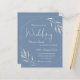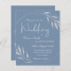 Um convite de casamento minimalista e elegante. O fundo azul empoeirado é decorado com uma coroa circular prateada com brilho e folhagem. Personalize adicionando os detalhes do evento de cheio.