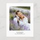 A borda esquerda deste elegante convite de casamento moderno apresenta uma cor d'água roxa, borda agitada, aparada com falso brilho dourado. O texto personalizável combina a escrita manual de cinzas de carvão, as fontes em copperplate e itálico em um fundo branco. Substitua facilmente a imagem de exemplo no verso por sua própria foto vertical e adicione uma breve mensagem com informações adicionais, como o URL do site de casamento.
