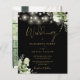 Este elegante convite de casamento preto e dourado, com luzes bonito de cordas e verde floral, pode ser personalizado com as suas informações em tipografia gráfica, com a sua fotografia especial no verso. Projetado por Thisnotme©
