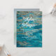 Convite de casamento exclusivo para fundo aquático com texto grande para nomes de casais. Linda água azul é o pano de fundo para o texto branco e um grande sinal de "e" atrás dos nomes. O reverso tem uma imagem oceânica de ondas de choque.