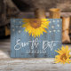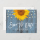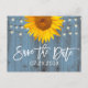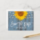Convites de casamento de girassóis rústicos e luzes de corda azul empoeirado para guardar a data em celeiro.